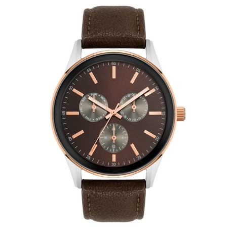 Presenting a stylish 43mm round alloy case with a rose-gold tone bezel, this watch exudes sophistication. The brown fine sunray dial features rose-gold tone stick indexes, GUN CD textured faux sub-dials, and practical sub-dials with date and day displays. ...