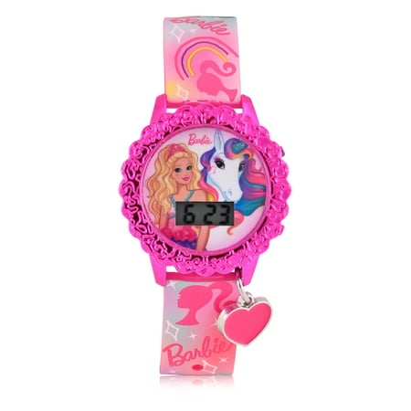 Barbie flashing lights LCD watch. Textured pink plastic bezel. Printed art dial with multi-colored flashing lights. Pink heart shaped hanging charm. Printed Barbie art on plastic strap.
