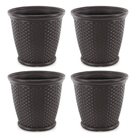 Show off your favorite flower or plants with the 4-pack Wicker Garden Planter from Suncast. The lightweight and stylish dark brown design of these round planters adds aesthetic value and offers unparalleled versatility, catering to the diverse needs of gar...