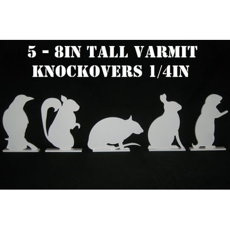 Set includes one 5”x 8” crow, one 5”x 8” Prairie Dog, one 5”x 8” Rabbit, one 5”x 8” Rat and one 5”x 8” Squirrel target. Targets are constructed of new 1/4 in. thick A36 steel painted white. Targets are on 1” x 5” pads assembled with...
