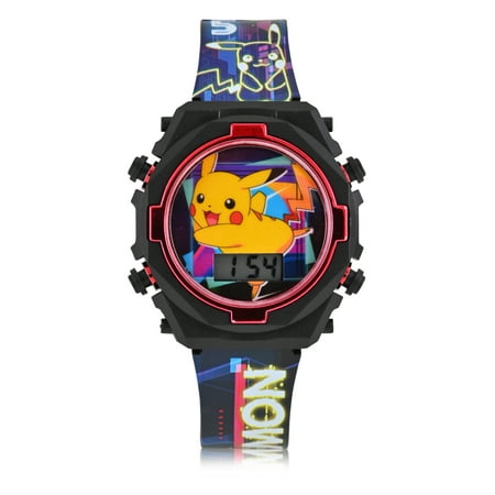 Pokemon flashing lights LCD watch. Contrast colored case. Printed art dial with multi-colored flashing lights. Printed Pokemon art on plastic strap.