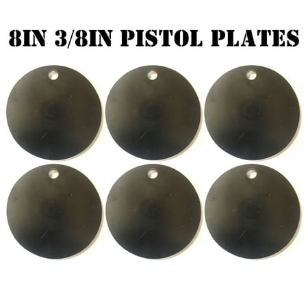 Set includes six 8in. round hanging metal targets with a 5/8" hole for mounting. Great for .22LR, 40cal, 9mm, .45acp, and most other pistol calibers. Manufactured to meet NRA Action Pistol specifications from new high quality 3/8in. thick A36 (mild) steel ...