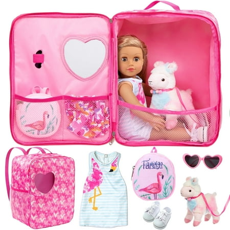 This stylish 18-inch doll accessory set from K.T. Fancy includes a chic pink carrier bag with a love pattern design, perfect for transporting your doll in style. The set also features a flamingo-themed skirt, a pair of white cloth shoes, a pink ostrich-pat...