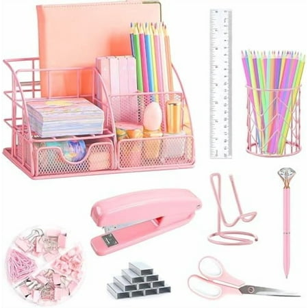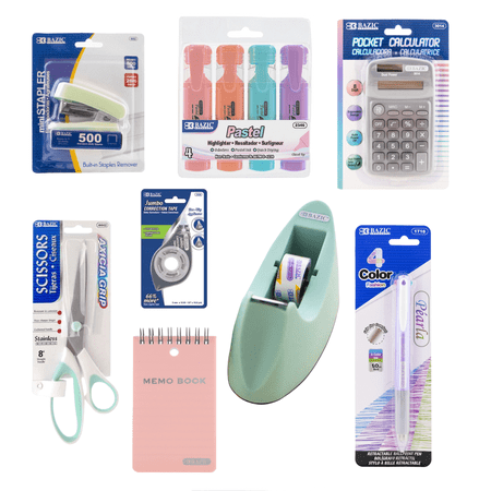 Elevate your workspace with this charming 13-piece office supplies and desk accessories starter bundle in soft pastel colors. Featuring a mini stapler with 500 staples, a full-sized tape dispenser, scissors, a memo book, a calculator, a retractable pen wit...