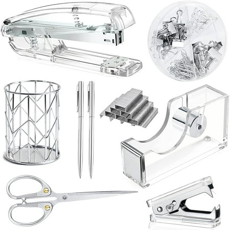 Packing Listing 1x stapler, 1x staple remover, 1000 x staples, 1 x tape holder, 1 x pen holder, 2 x pens, 1 xscissors and 1 x box of binder clips; This silver office supplies set can meet your needs in daily life and work, keeping your desk or desk drawer ...