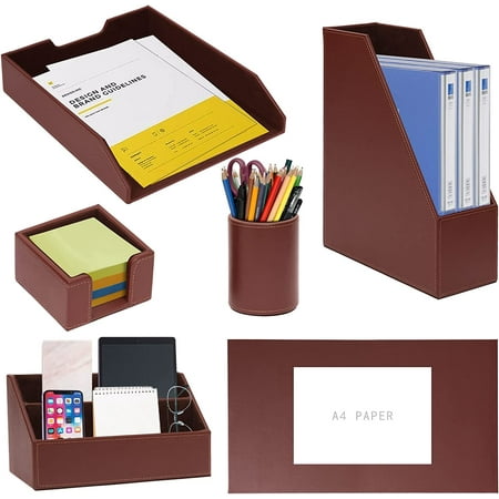 Product description A good choice for a gift 6 Piece Office Supplies/Desk Organizer Set - with Desktop Leather Writing Pad,File Paper Tray,Magazine folder Holder, Pen Cup,Sticky Note Holder,Letter Mail Sorter,Workspace Decor for Women Men Reinforced with h...