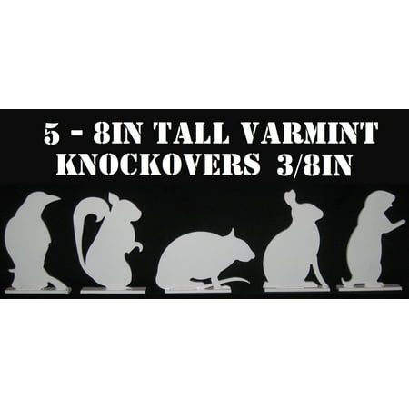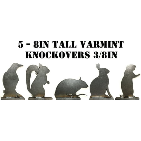 Set includes five 5in.x8in. targets, 1-Crow, 1-Prairie Dog, 1-Rabbit, 1-Rat and 1-Squirrel on 1in. x 5.25in. pads Great for .22LR rim-fire, 9mm and .45ACP calibers Manufactured from new high quality 3/8in thick A36 (mild) steel plate made in the USA Target...