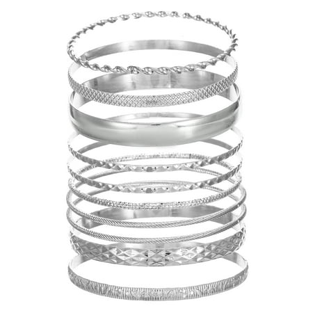 Shine on with this 10-Piece Bracelet Set from Time and Tru featuring a variety of textured silver-tone finishes to add dimension to any look. Stack them up, wear them solo or mix-and-match them with other items in your jewelry box -- the possibilities are ...