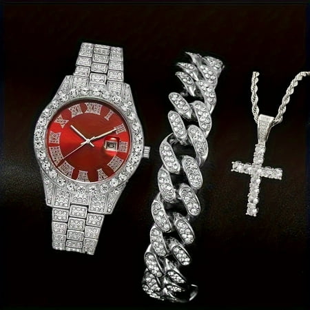 Feature: • Material: Quartz movement, Spiral crown, the case and strap are made of alloy material, which is not easy to damage. • Three-piece suit: A watch's dial with a flowing rhinestone, a diamond-studded bracelet and a simple fine bracelet. • Lux...