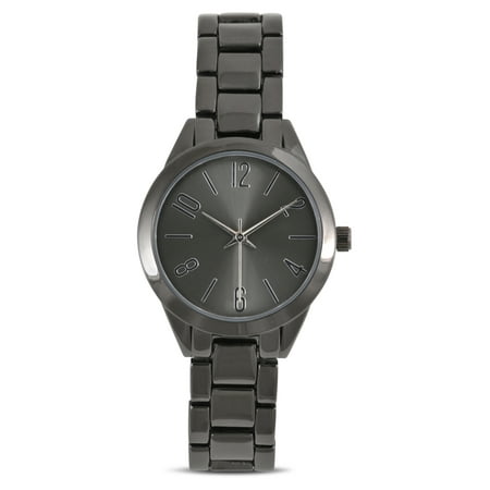 Gunmetal round case, gunmetal dial, gunmetal link bracelet watch.