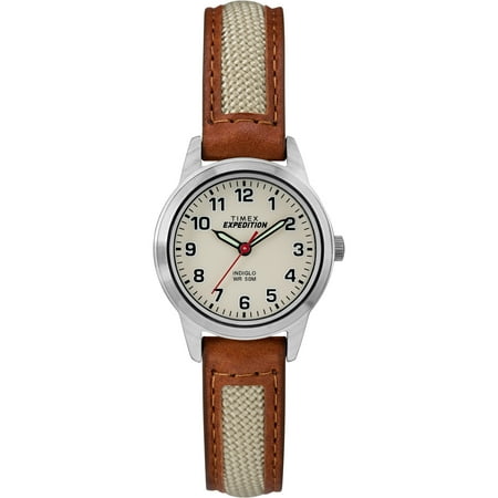 Our 26mm well-crafted field mini watch design gives you rugged metal construction, a natural beige fabric strap with rich brown leather trim, Indiglo night-light and is water resistant up to 50 meters.