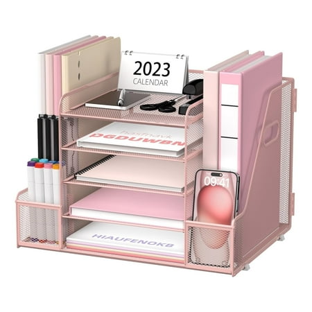 This 5-tier desk organizer from INTIGE have 4 sliding trays, 2 pen holders, and 2 vertical magazine racks, it provides ample storage space for files, office supplies, and even books and magazines. Crafted from metal materials, this organizer is built to la...
