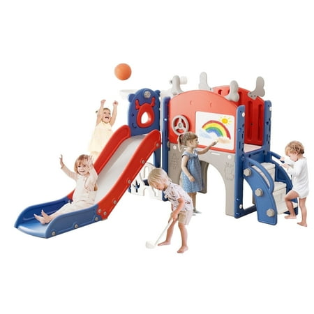 Toddler Slide Playset New Upgrade! KORIMEFA toddler slide incorporates 12 activity areas, Newly launched the painting board and golf set which parts others without, including slide way, golf clubs and balls, drawing board and brush eraser, Steering heel, c...