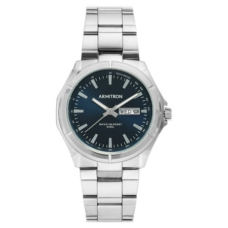 Heading from the office to dinner? No need to change your watch with this classic silver-tone stainless steel bracelet from Armitron. The navy blue sunray dial features silver-tone markers, white printed outside minute track, calendar window at 3H and tach...
