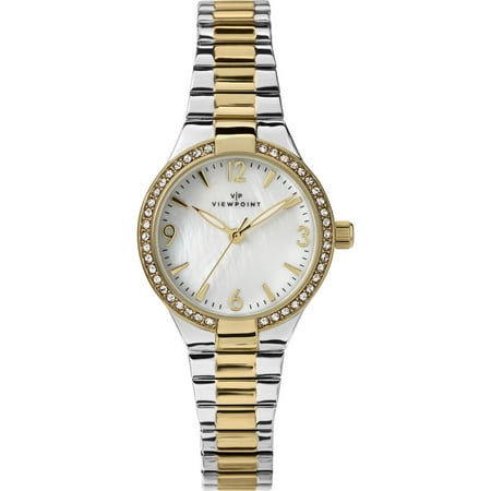 Accessorize your outfit with this elegant Viewpoint by Timex watch featuring a round 33mm two-tone case, mother-of-pearl dial, and matching expansion band. The partial Arabic numerals and hour markers offer a truly timeless look. With 30 meter water resist...