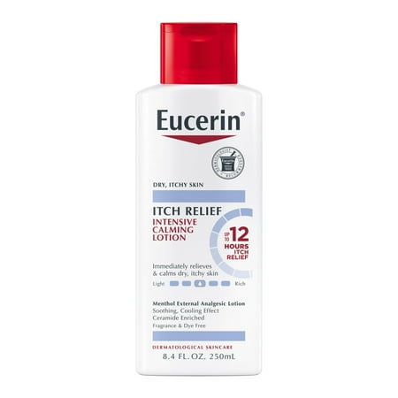 Eucerin Itch Relief Intensive Calming Body Lotion immediately relieves and calms itchiness caused by dry skin and provides up to 12 hours of itch relief. This itchy and dry skin lotion is formulated with cooling menthol to provide instant relief from the i...