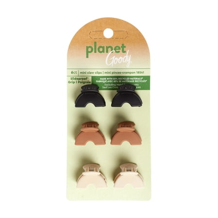 Planet Goody Slide Proof Mini Recycled Claw Clips, All Ages, Neutral Assorted Colors, 6 Ct are made with 83% recycled materials, excluding metal components. The Slide proof grip is made for all day wear, for all hair types! Packaging is at least 94% post-c...