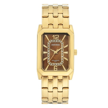 Tie together your look with this gold-tone stainless steel bracelet from Armitron. The brown genuine Mother-of-Pearl Dial features gold-tone markers and a center zone set with genuine crystals. The bracelet closes with a one touch, two button fold-over buc...