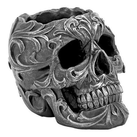 Elegant skull pen holder designed as a skull shaped grim reaper container, that is perfect for holding pens, pencils, tools, and more! This desk accessory has an all-around dimensional scrollwork pattern that is hand painted and made from poly resin. Dimen...