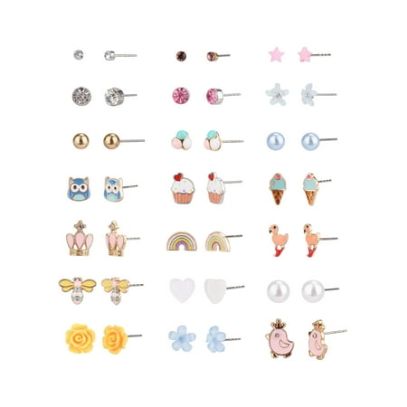 Wonder Nation Teen Female Multi Plate 21-Pair Earring Set. Acrylic stone and metal post earrings. Owl, cupcake, crown, rainbow, flamingo, ice cream cone, bird, and bee motifs.