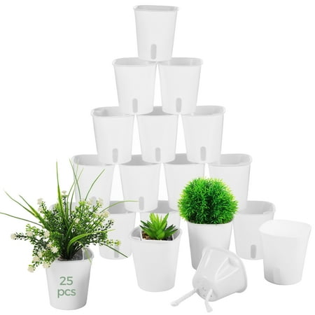 Color:white Material:plastic Product Size: 3.4 x 3 in Package Includes:25 Pcs Self-Watering Pots Note: - Please refer to the measurement. Tiny measuring error is allowable in normal range. - There might be a little color difference due to the monitor, came...