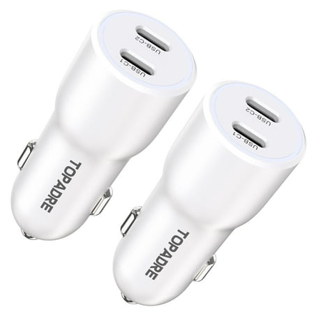TOPADRE 2 Pack 40W USB-C Fast Car Charger features dual USB-C ports compatible with iPhone, iPad, Samsung devices, and more. Designed for cigarette lighter adapters, it offers efficient charging with 20W per port and supports DC 12-24V input. The compact c...