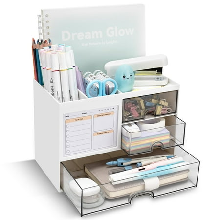 【Versatile Design】The desk organizer offers ample storage space with 2 pen holders, 1 top tray, 1 notebook holder, 1 note slot, 2 drawers, and 1 large drawer. It provides enough capacity to organize and categorize your office supplies, allowing for a c...