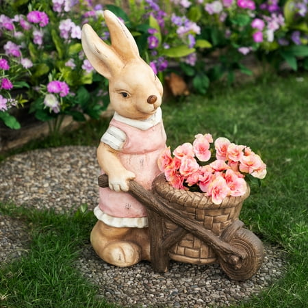 Welcome spring to your garden with this girl Easter rabbit outdoor garden planter. This planter features a rabbit figure pushing a wheelbarrow basket, providing a charming spot for your plants. A unique Easter decoration, this planter adds a whimsical elem...