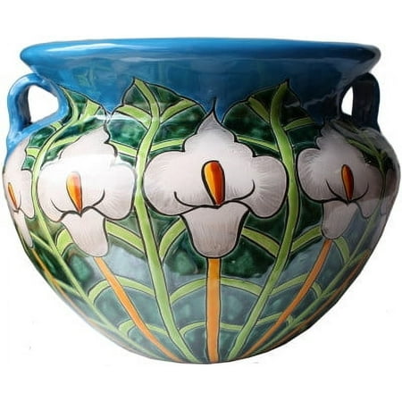 Big Lily Flower Talavera Ceramic Pot. This pot has a light blue background and a few beautiful handpainted lily flowers, with yellow pistils, all the way around it. A unique addition to your garden landscape! Talavera Ceramic pots have a drilled hole at t