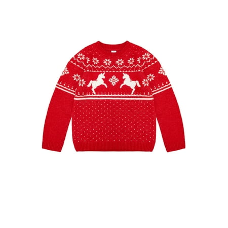 Celebrate the season in style with the Wonder Nation Girls Holiday Sweater! Crafted from soft souffle yarn, this cozy sweater features a classic crew neck, long sleeves, and rib trim at the neck, cuffs, and hem for a snug, comfortable fit. Adorned with ado...