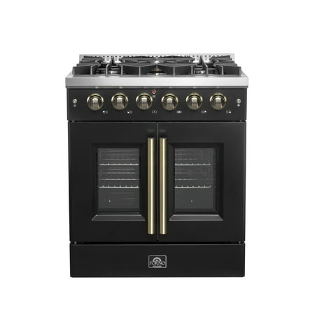 The Forno Galiano 30" French Door Gas Range in black brings professional styling and performance into your home kitchen at an affordable price. Enjoy effortless access to your oven with French doors that offer an extra 12 inches of space. The cooking surfa...
