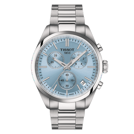 Brand New Authentic Tissot PR 100 Chronograph Quartz Ice Blue Dial Steel Men's Fashion Watch Model T150.417.11.351.00. Brushed and Polished Stainless Steel case with Brushed and Polished Stainless Steel Bracelet watch band. Brushed and Polished Stainless S...