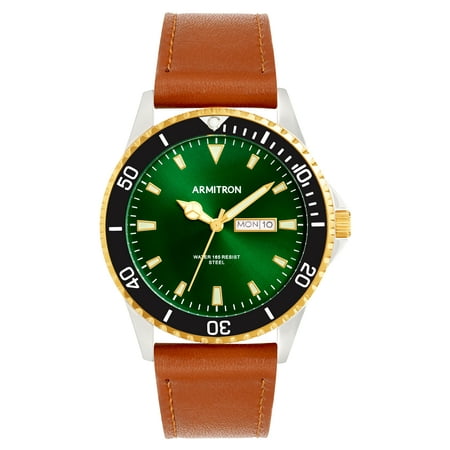 With a gold two-tone round case, this timepiece showcases a striking green dial paired with a brown leather band and secured by a classic buckle closure. With a 50-meter water-resistant design, UP indexes, and a calendar displaying day and date functions, ...