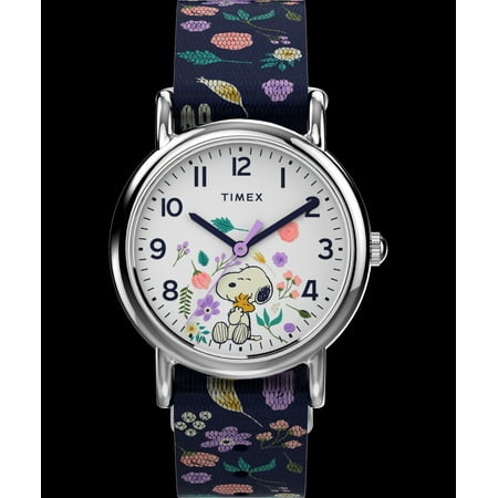 A bouquet that stays! Celebrate the sweetness of spring year-round with the Peanuts Floral, featuring the 31mm silver-tone case construction of our beloved Timex Weekender. A colorful floral motif blooms throughout its comfortable fabric strap, while a smi...