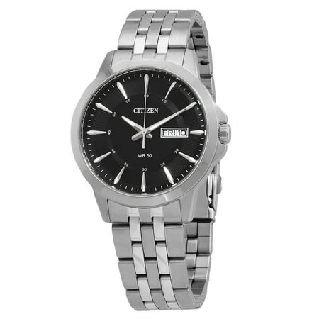 Black dial enhanced by luminous silver-tone hands. Silver-tone stainless steel case with a silver-tone stainless steel band. Quartz movement. 50 meters / 165 feet water resistance. Fixed bezel. Scratch Resistant Mineral crystal. Solid caseback. Fold Over w...