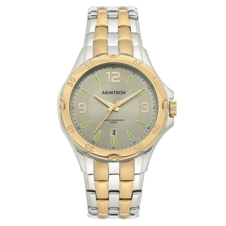 Easily keep track of your time with this two-tone stainless steel bracelet from Armitron. The silver dial features green luminous filled gold-tone Arabic numerals and markers, a calendar window at 6H and a black printed outside minute track. The bracelet c...