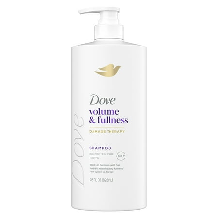 Dove Shampoo for Women Volume & Fullness with Bio-Protein Care Technology and Biotin, 28 oz. Bring all day body and fullness back to your hair with Dove Volume & Fullness shampoo. This volume formula turns flat hair into all-day voluminous hair for 99% mor...