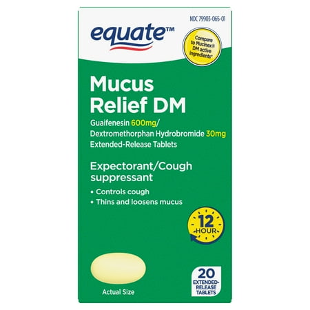 Experience relief from cough and chest congestion with Equate Mucus Relief DM extended-release tablets. Each dose contains Dextromethorphan Hydrobromide 30 mg and Guaifenesin 600 mg. Compare to the active ingredients of Mucinex® DM*. This powerful combina...
