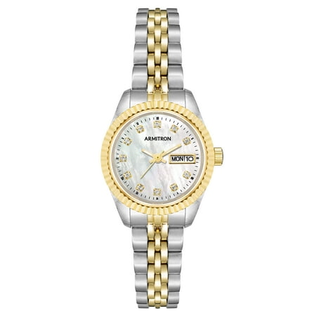 Armitron Adult Women's Two-Tone Mother of Pearl 24mm Watch. Comes with an Adjustable Metal Bracelet with Double Locking Fold Over Clasp. The Watch is Battery Powered with a Quartz Movement. Has a Day, Date Function and is Water Resistant.