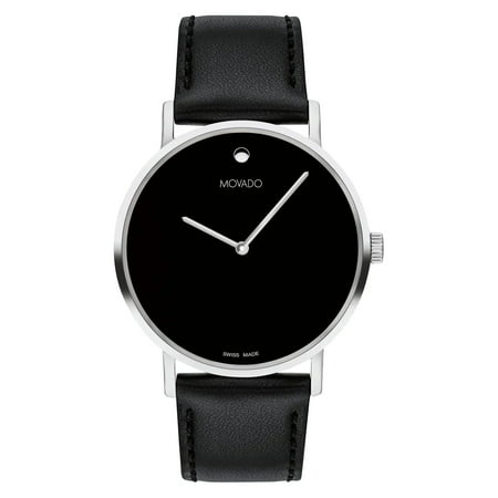 An icon of modern design, Movado Signature watch, 40mm, stainless steel case, black dial, black leather strap