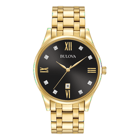 Bulova's Men's Modern Collection features the best in geometric silhouettes and cutting-edge design. Featuring a 3 Hand, Calendar, black IP Stainless Steel 42mm case with a Mineral Crystal, gold-tone hands and 3 diamond hour makers. Water resistant to 30 m...