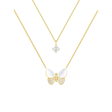 This Believe by Brilliance adult double necklace set is crafted in 14KT gold flash plated brass and features mother of pearl and cubic zirconia. The shorter 16” chain is a lovely diamond cut cable with a classic 5mm solitaire cubic zirconia and includes ...