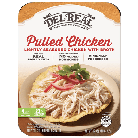Hispanic Flavors for Modern Life Bring Hispanic flavors to modern-day life with 15 ounces of Del Real Foods Lightly Seasoned Pulled Chicken! Made with 50% chicken breast and 50% chicken leg meat, our fully cooked Pulled Chicken is simmered in its juices an...