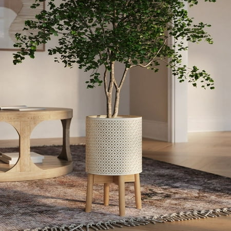 Elevate your indoor garden with the Fluted Metal Planter Pot With 4-Leg Wood Base - (Medium) - 17"H x 10"W, a stylish and functional addition to any home. This planter features a beautiful beige and gold pot that perfectly complements its mid century moder...