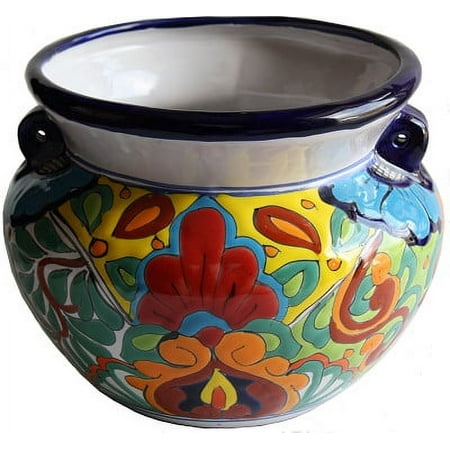 Rainbow Talavera Ceramic Pot. This pot has a dark blue background and hand-painted with a rich gamma of different shapes is a multicolor composition. Talavera Ceramic pots have a drilled hole at the bottom; this enable them to be used as a planter. If you