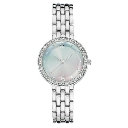The watch features a 32.5mm round alloy case with fixed lugs, enhanced by a bezel embellished with 56 clear crystals. Its pastel sunray degrade dial displays Arabic numerals at the 12 and 6 positions, and dot markers for the other hours. Completing the des...