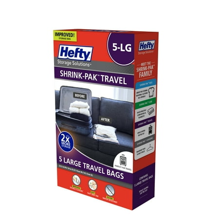 Hefty branded Compression Travel Storage Bags! 1 Box contains (5) Travel Bags. Simply roll your bags to compress air out of the bag...no vacuum required! Travel Bag Dimensions = 22.5" x 18". Adults and Tweens. When you're traveling use SHRINK-PAK travel ba...