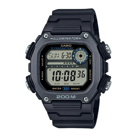 Large 47mm case Large Side Buttons for Easy Operation LED Light10-Year Battery Lifeworld timeStopwatchCountdown Timer5 Alarms Automatic Calendar12 24 Hour Formats Water Resistant to 200 Meters Black Resin Strap