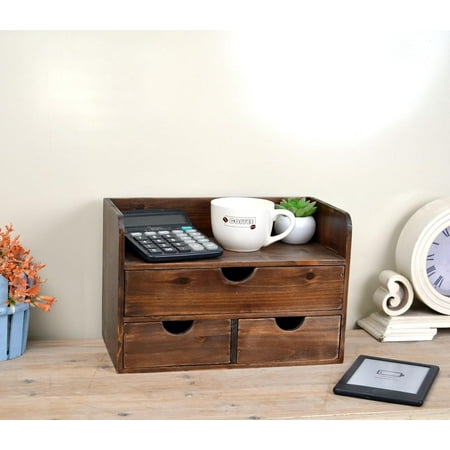This wooden desktop organizer can organize and tidy up your desktop space. It has one large drawer and two small drawers, plus a top storage rack. Very suitable for storing office supplies, kitchen supplies, cosmetics, etc. You can not only keep your deskt...
