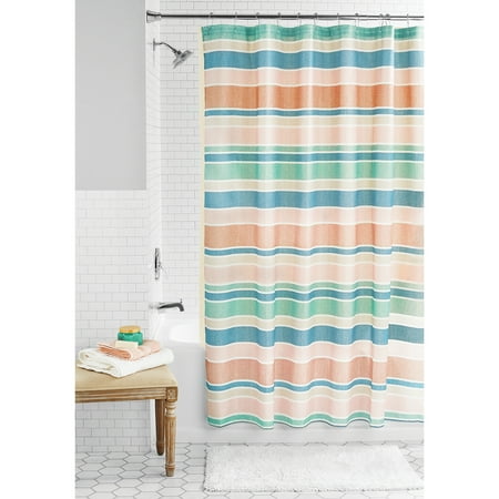 Add a fun pop of pattern to your bathroom décor with the Mainstays 14-Piece Multi Stripe Polyester Shower Curtain and Liner Set. A cheerful addition to your main bathroom or guest bath décor, this fabric shower features wide and narrow multicolor stripes...